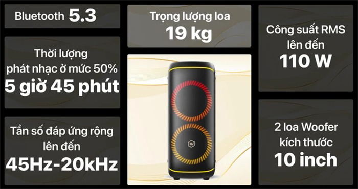 Hệ thống 2 đường tiếng: 2 Woofer (10 inch), cho nền nhạc chắc chắn, tiếng bass không bị rè hay méo. 2 Tweeter (2.5 inch), âm trung và âm cao trong trẻo dễ nghe, tiếng treble không chói gắt. Tạo nên chất âm bùng nổ và giàu năng lượng cho buổi tiệc.