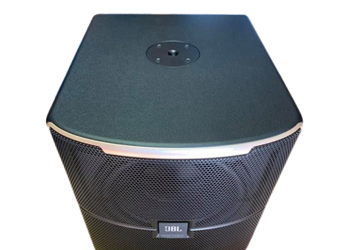 Mặt trên của loa siêu trầm JBL Pasion 12SP được định vị sẵn lỗ cắm dựng thanh chống loa để lắp đặt model loa full range.