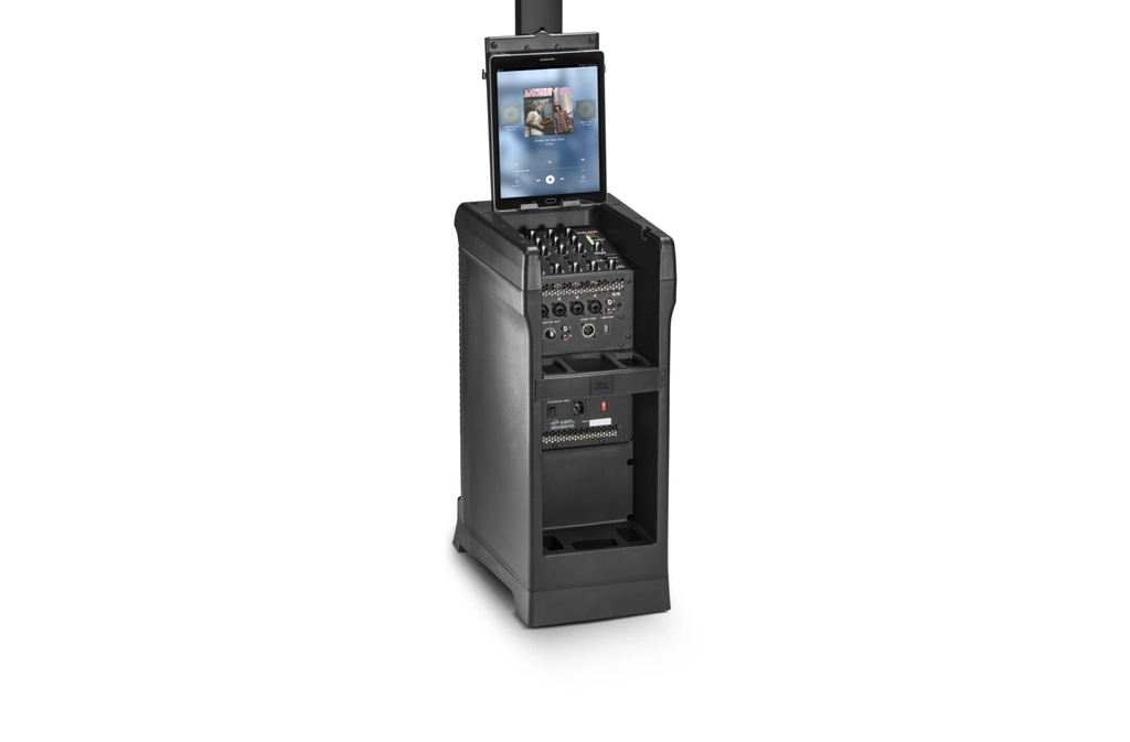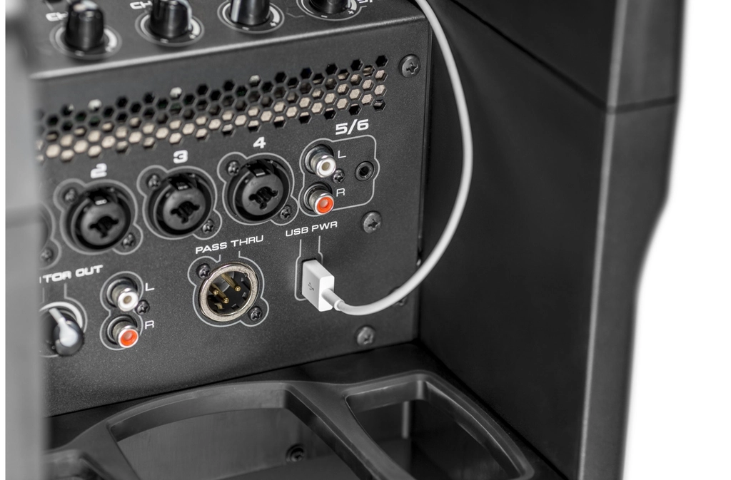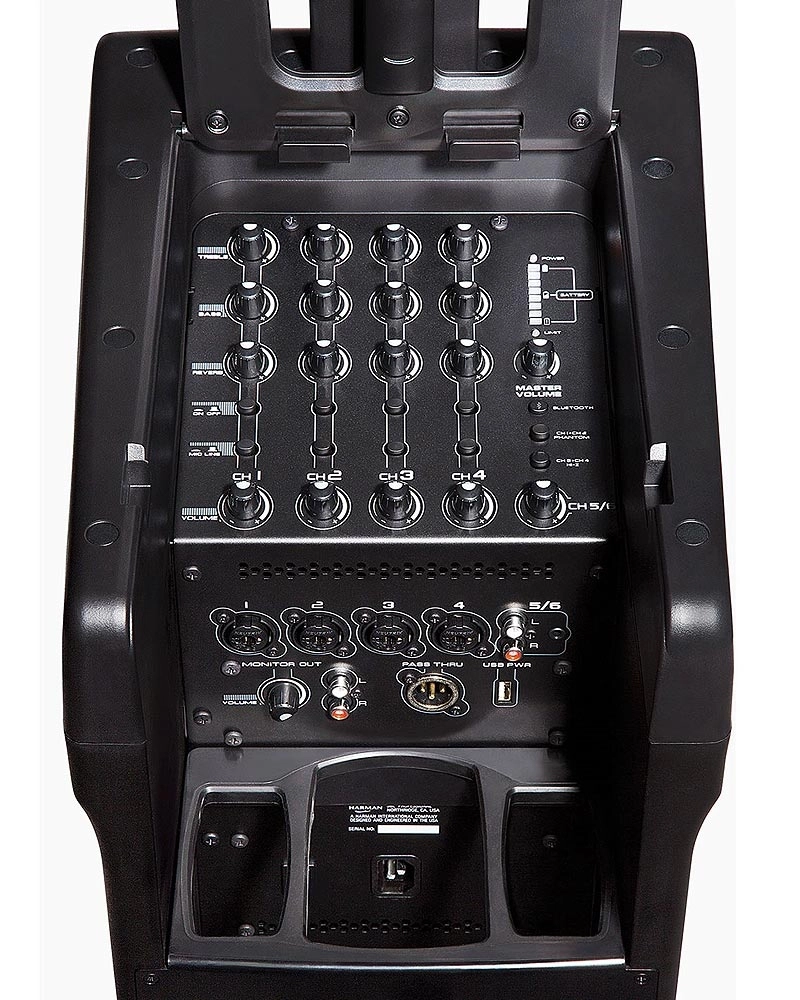 Mixer được thiết kế với 6 đường vào gồm: 2 ngõ vào đa năng có thể cắm jack 3mm, jack dùng cho MIC hoặc nhạc cụ, 1 ngõ RCA, 1 ngõ 6mm, 1 ngõ 3,5mm và sau cùng là kết nối Bluetooth. Các nút chỉnh bao gồm volume tổng, volume từng kênh, nút chỉnh treble/bass, nút chỉnh reverb. Ngoài ra, trên Loa PA Active linear array JBL EON One còn có một ngõ ra RCA dùng để ghép với một chiếc loa Loa PA Active linear array JBL EON One khác nhằm mở rộng gấp đôi phạm vi và âm lượng cần phục vụ.