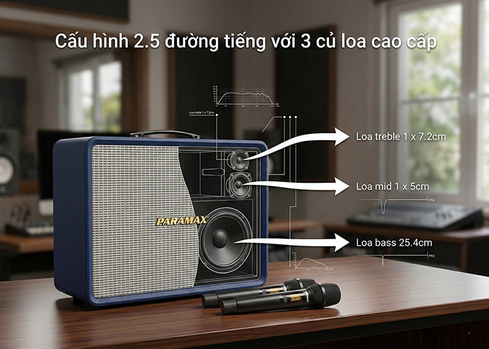 Với cầu hình 2.5 đường tiếng: loa trung trầm (25.4cm) + loa trung cao (5m) + loa siêu cao (7.2cm). Tái tạo đầy đủ dải tần, bass sâu nhưng không bị ù rền, mid giúp làm nổi bật vocal trên nền nhạc khi hát karaoke, treble sáng – không chói tai khi lên cao.